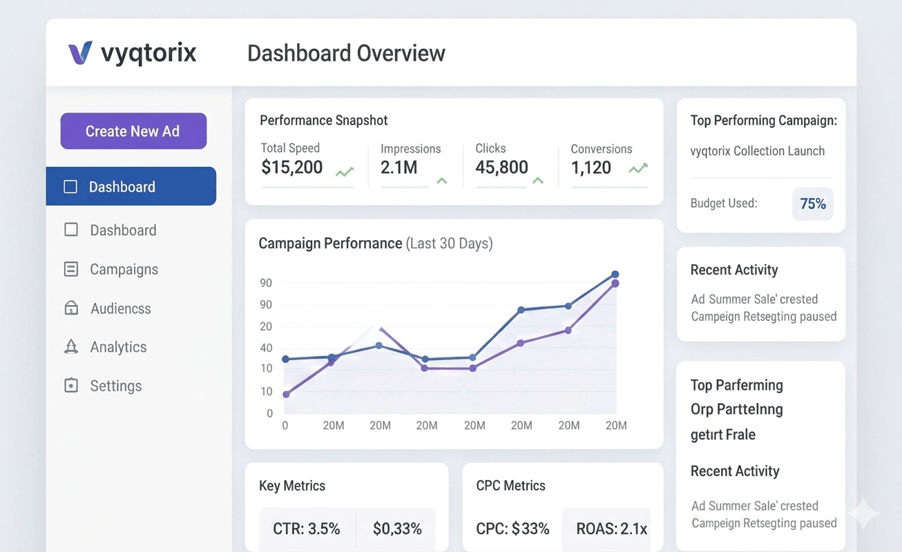 Creating effective advertisements can be time-consuming. Vyqtorix uses intelligent automation to assist in generating engaging ad copy and audience targeting strategies that help improve campaign performance.